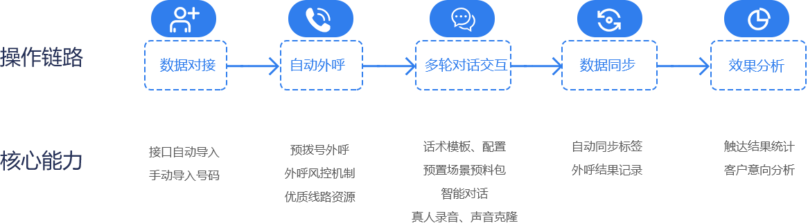 基于全宇智能AI外呼平臺,利用平臺核心能力,為項(xiàng)目從數(shù)據(jù)對接、自動外呼、多輪對話交互、數(shù)據(jù)同步到效果分析等提供完整的外呼操作鏈路方案。